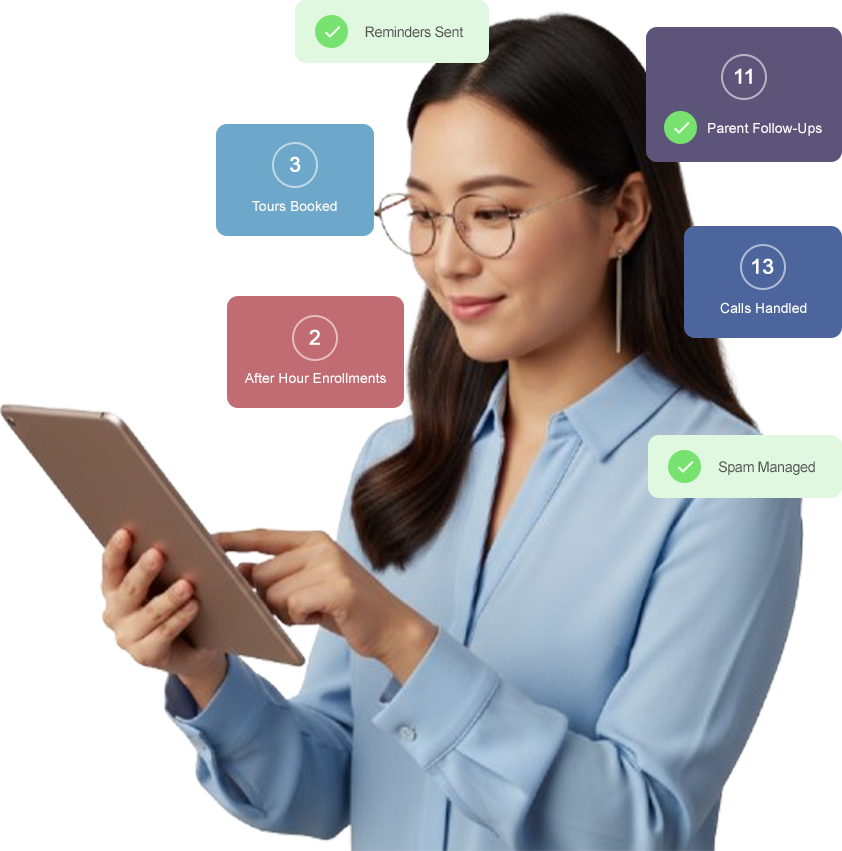 Think of it as your best enrollment specialist, available 24/7. It answers calls instantly, speaks with warmth, and guides parents toward the next step, whether that’s booking a tour, enrolling on the spot, or joining your waitlist. No missed calls, no lost chances.